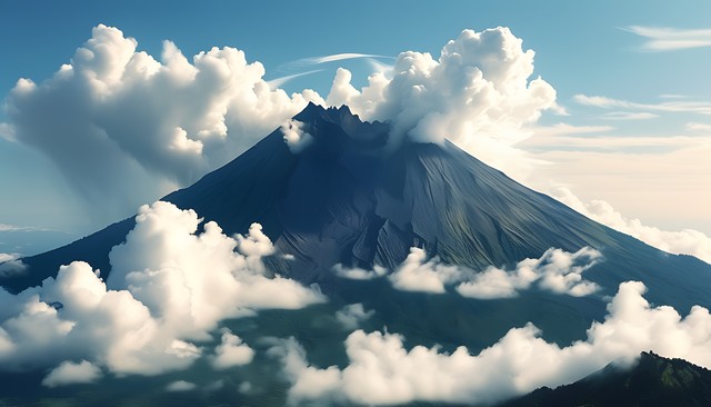 一座雄伟的火山,顶部被云层环绕,展现出大自然的壮丽景象,触发人们对自然力量的思考。