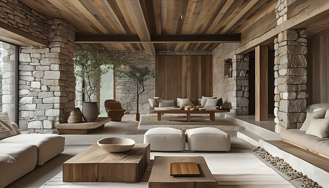 一个现代风格的室内空间,结合了石材和木材的原始自然元素,营造出舒适宁静的氛围。