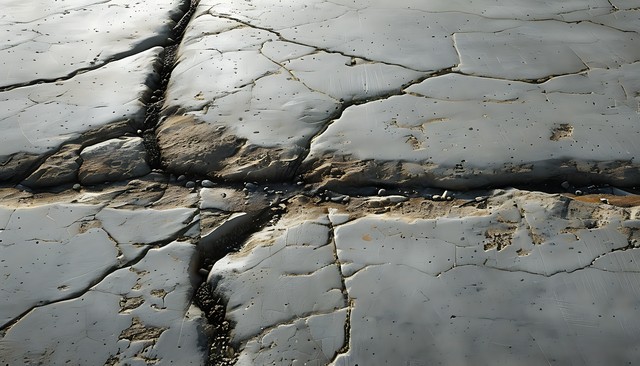 一块表面粗糙的混凝土地面,包含明显的裂缝与纹理,透出一些自然的元素与图案。