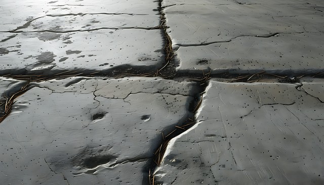 一块表面粗糙的混凝土地面,包含明显的裂缝与纹理,透出一些自然的元素与图案。