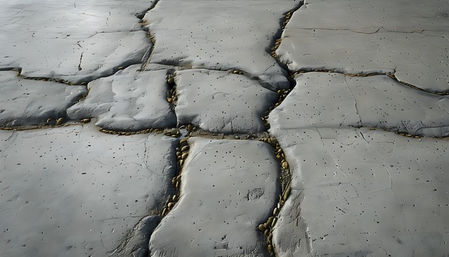 一块表面粗糙的混凝土地面,包含明显的裂缝与纹理,透出一些自然的元素与图案。