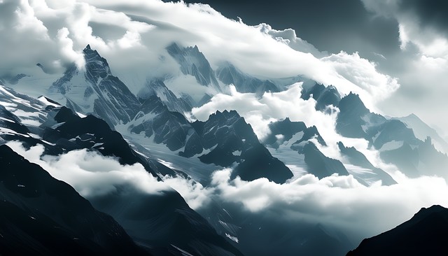 黑白色调的山脉与云雾交织的壮丽景色,展现出自然的雄伟与神秘。