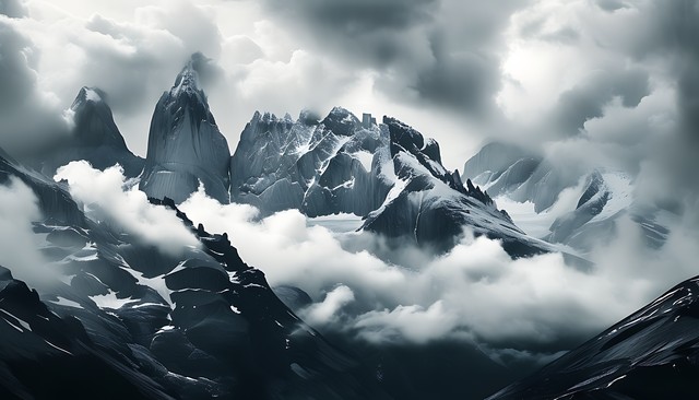 黑白色调的山脉与云雾交织的壮丽景色,展现出自然的雄伟与神秘。