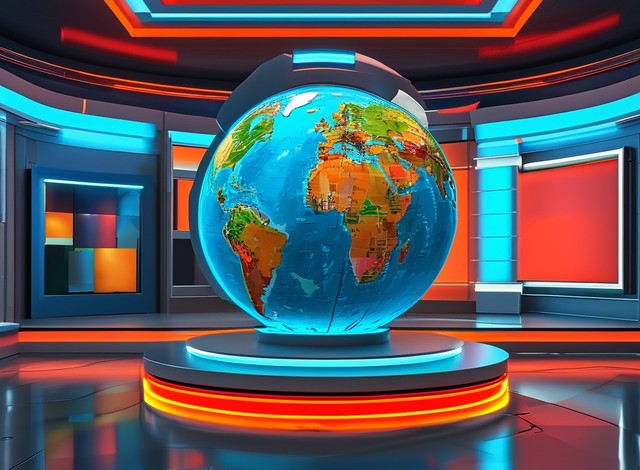 图形数字世界新闻背景,地球内部大平面电视屏幕现代工作室抽象艺术新闻