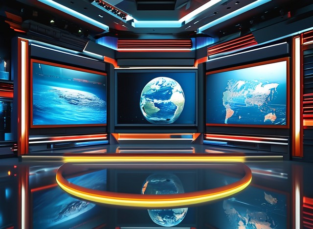 图形数字世界新闻背景,地球内部大平面电视屏幕现代工作室抽象艺术新闻