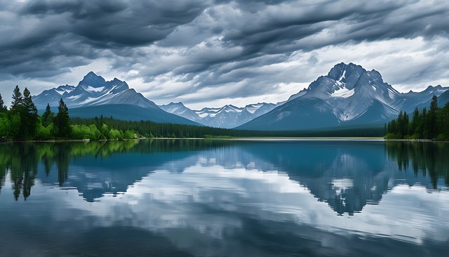 宁静的湖泊与巍峨的山脉相伴,阴云密布的天空映衬着大自然的壮丽,展现出浓厚的自然气息与和谐之美。
