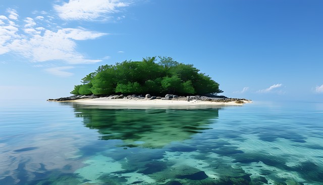 一处宁静的海岛,环绕着清澈的海水与宁静的天空,展现出自然的和谐美景,适合人们放松和享受大自然。