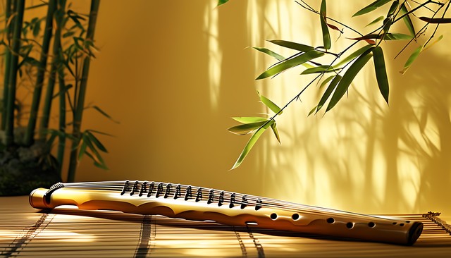 温暖的黄色调下,细致的竹笛与自然元素交织,传递着宁静与和谐的氛围,带有淡淡的光影变化。