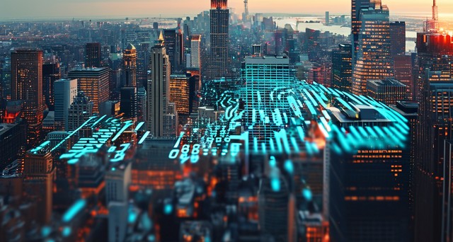 带有数字指纹和二进制代码覆盖的纽约城市景观。安全和技术的图形概念。双重曝光