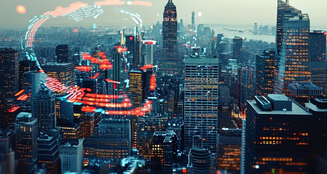 带有数字指纹和二进制代码覆盖的纽约城市景观。安全和技术的图形概念。双重曝光