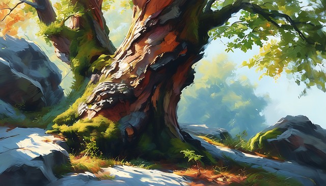 大自然中的树皮纹路与岩石表面相融合,呈现出一幅和谐美丽的自然艺术,光影交错,色彩丰富。