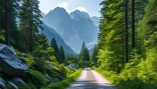 宁静的山间小路,四周环绕着青翠的森林与高耸的山峰,仿佛置身于大自然的怀抱中。