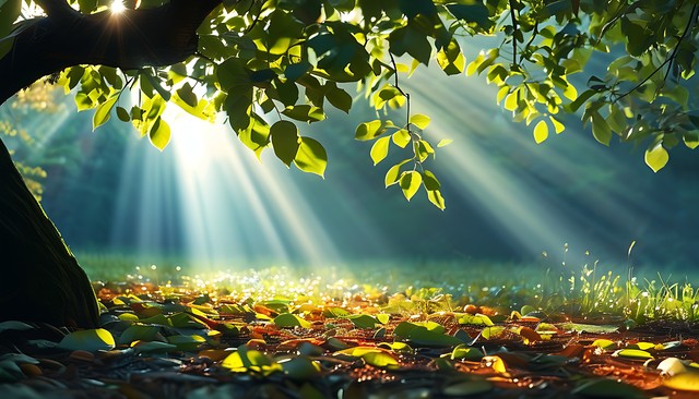 在自然环境中,阳光透过树叶洒在地面的美丽景象,展示了大自然的宁静与和谐