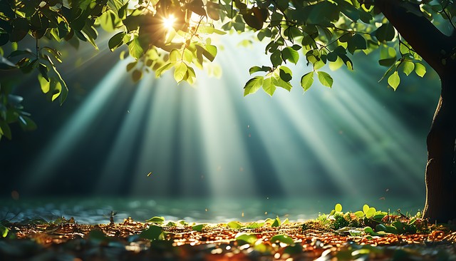 在自然环境中,阳光透过树叶洒在地面的美丽景象,展示了大自然的宁静与和谐