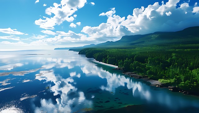 茂密森林与海岸线相交融的壮丽景观,蓝天白云映衬下的自然美景,展现出大自然的神奇魅力。