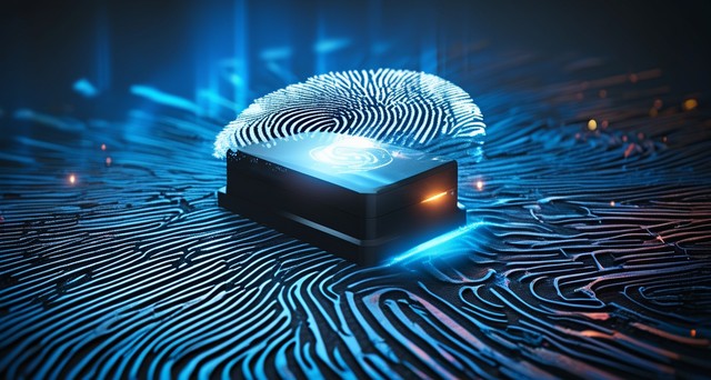 网络安全和指纹扫描解锁技术概念。访问数据网络,数字隐私云通过生物特征识别保护业务免受蓝色背景下的在线
