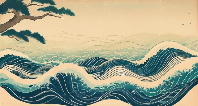 日本背景,手绘线条波浪元素矢量。东方自然图案,复古风格的海洋装饰横幅设计。海洋模板