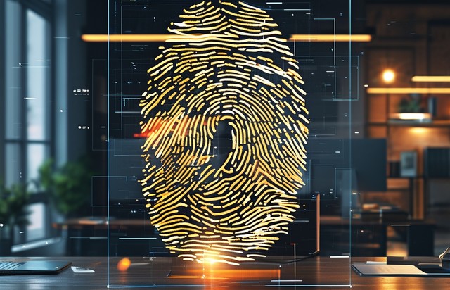 虚拟指纹扫描界面在空旷的现代办公室背景上多重曝光,数字访问概念
