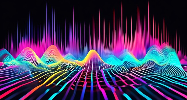 彩色声波。音频数字均衡器技术,音乐脉冲矢量插图。声线波形或音量级符号。曲线无线电波