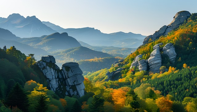 秋季的山脉景色,绿色树林与岩石层叠错落,透出自然的宁静与美丽。