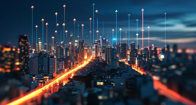 夜间城市景观上的数字箭头,象征着增长和技术。