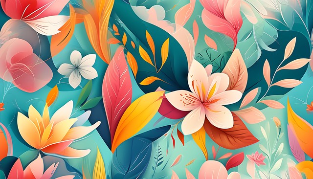色彩丰富的抽象图案,融合了多种自然元素,如花朵和叶子,展现出和谐的色调与柔和的线条。