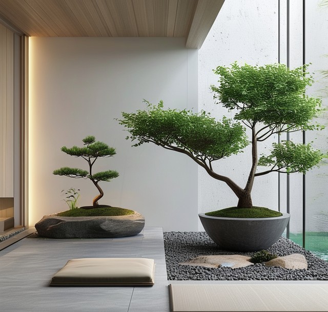 现代简约风格的禅意室内空间,配有盆栽与自然元素。