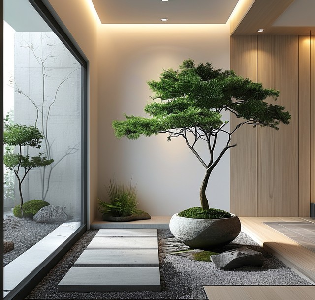 现代简约风格的禅意室内空间,配有盆栽与自然元素。