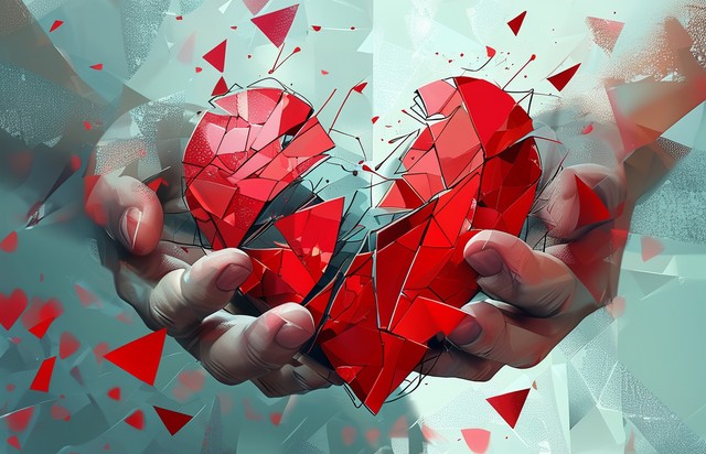手拿红色爱心抽象混搭线和构图,以破碎的部分三角形形状和散点的形式进行数字绘制。