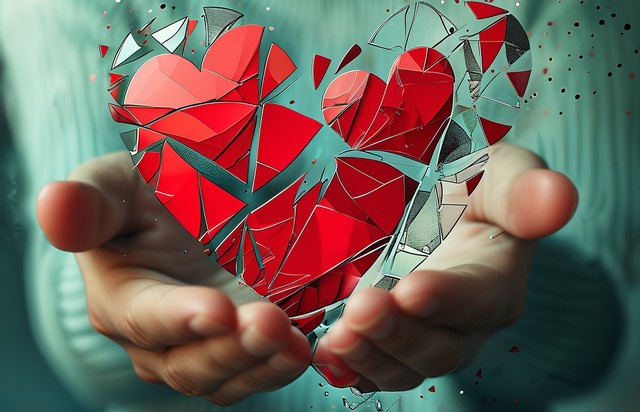 手拿红色爱心抽象混搭线和构图,以破碎的部分三角形形状和散点的形式进行数字绘制。