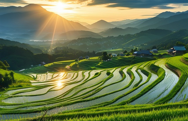 美丽的田园风光,阳光洒在波浪起伏的稻田上,山脉与村庄交错,和谐自然。