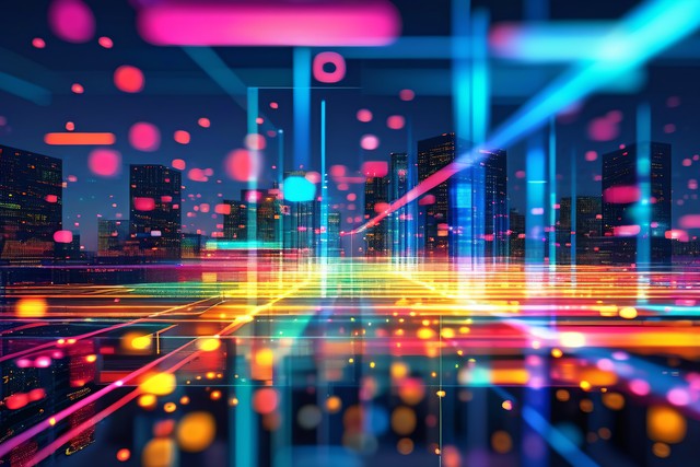 现代创意的网络节点在智慧城市中互联,在5G和无线技术的先进数字连接中