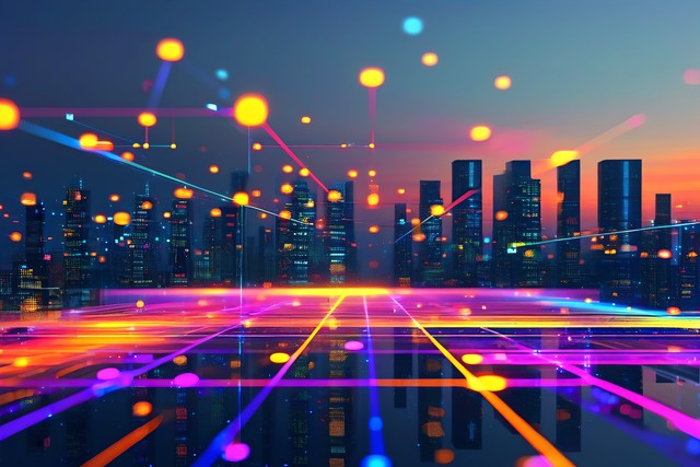 现代创意的网络节点在智慧城市中互联,在5G和无线技术的先进数字连接中