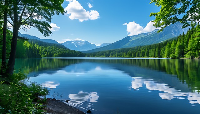 一片宁静的湖泊,周围是翠绿的森林和绵延的山脉,蓝天上漂浮着几朵白云,构成了和谐自然的画面。
