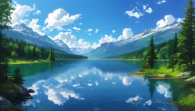 一片宁静的湖泊,周围是翠绿的森林和绵延的山脉,蓝天上漂浮着几朵白云,构成了和谐自然的画面。