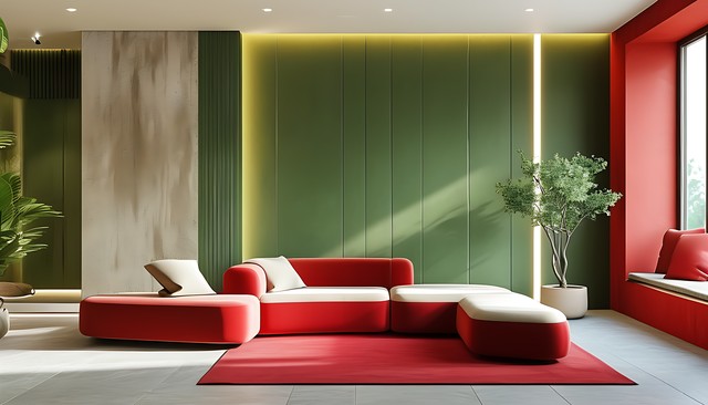 一个现代化的室内设计,配有绿红色不同元素的空间,光线明亮,氛围舒适,墙面和地板均体现出自然质感。