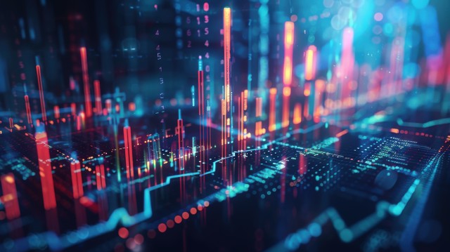 充满活力的金融景观:黑色玻璃表面上的红色和蓝色股票市场图表、特写细节和散景效果
