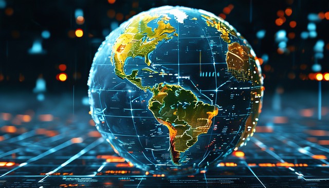 带有数字网格覆盖的地球仪,描绘了技术进步。