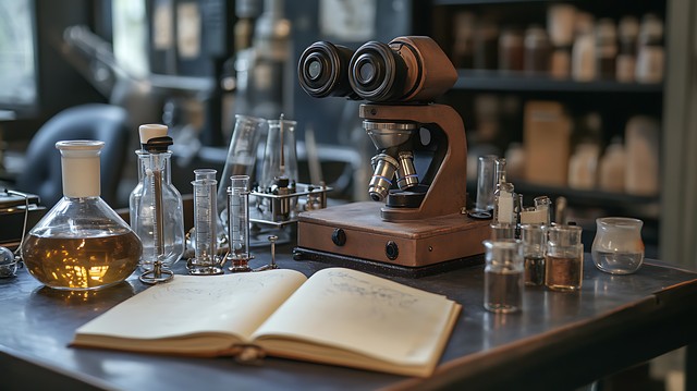 实验室中,防毒面具旁边放置着显微镜与实验记录本,体现严谨科学。