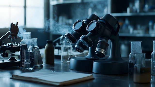 实验室中,防毒面具旁边放置着显微镜与实验记录本,体现严谨科学。