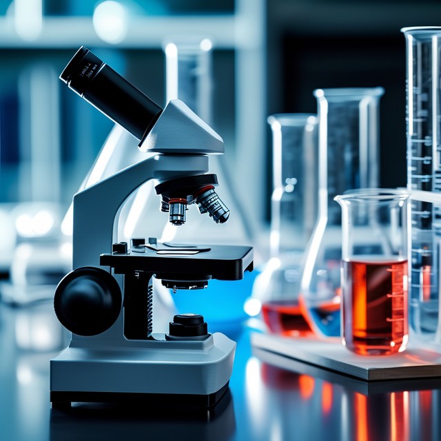 实验室中的科学显微镜数据分析特写,实验室中用于化学或科学研究技术发现的医学设备设置,用于研究的生物技
