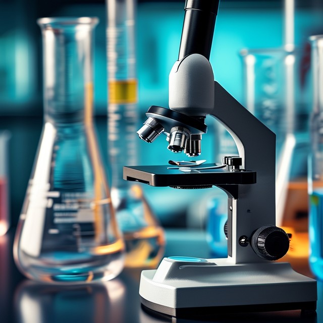 实验室中的科学显微镜数据分析特写,实验室中用于化学或科学研究技术发现的医学设备设置,用于研究的生物技