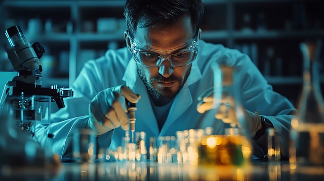 研究员穿着实验服,仔细调配试剂,周围充满了各种化学实验器材。
