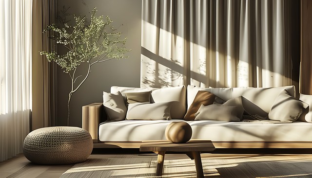 现代简约风格的室内空间,融合自然元素与舒适家具,营造出一个温馨的生活环境,阳光透过窗帘洒落在房间里。