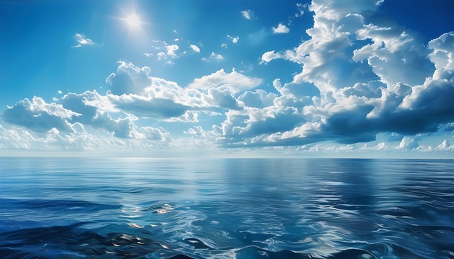 广阔的海岸线与蓝色海洋,海天相接,丰盈的云朵在阳光下漂浮,宁静而祥和的自然景色。
