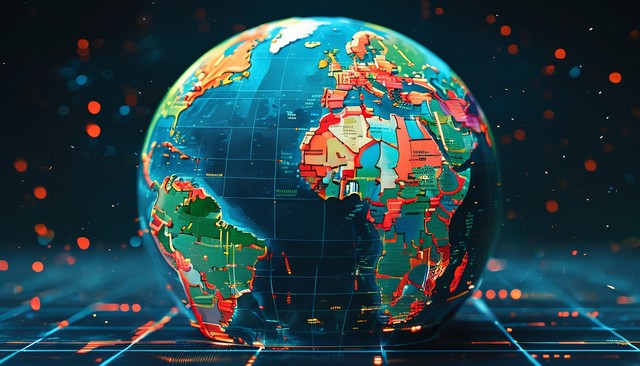 带有数字网格覆盖的地球仪,代表技术和全球化。