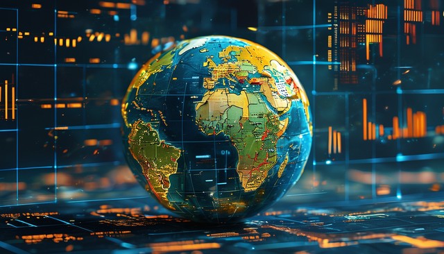 带有数字网格覆盖的地球仪,代表技术和全球化。