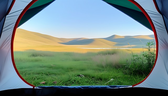 透过帐篷开口看到的宁静自然景色,远处是柔和的山丘和清澈的天空。