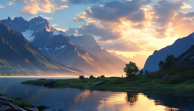 壮丽的山脉在阳光下闪耀,宁静的天空与大自然的和谐交融,展现出美丽的自然景观
