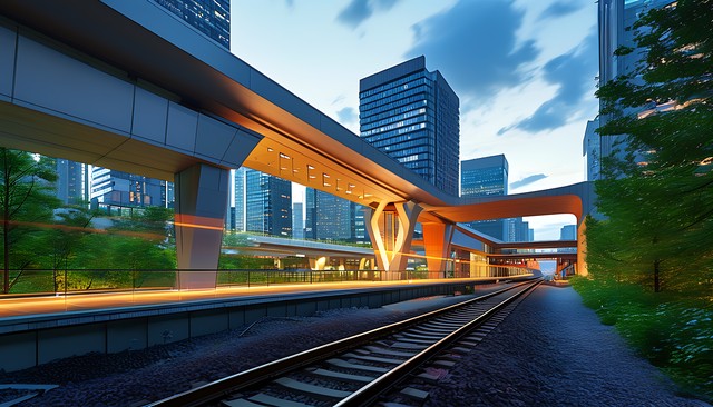 城市铁路枢纽的动感瞬间,现代建筑与自然元素和谐交融。